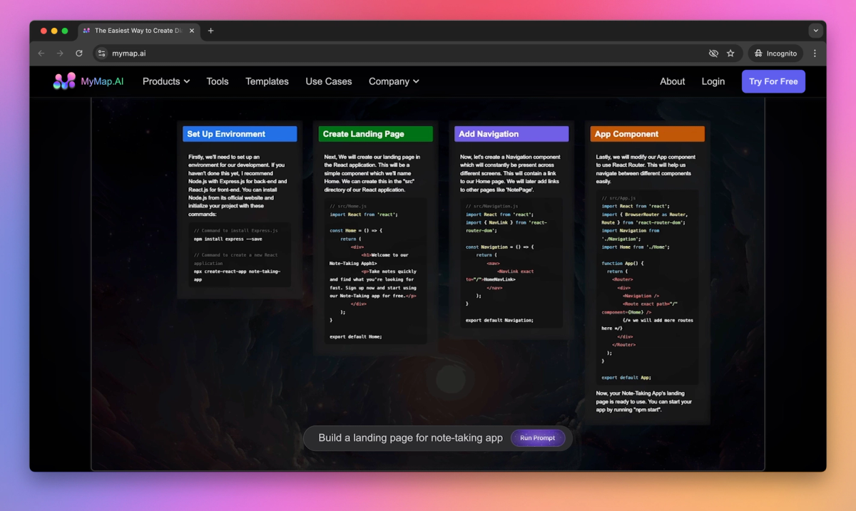MyMap.AI sets itself apart with its chat-based interface, allowing project managers to create visual diagrams by simply describing their ideas. The tool's ability to incorporate web search results into diagrams helps teams stay current with market trends and competitor strategies. MyMap.AI shines in scenarios like planning product launches, where managers can quickly map out timelines and key milestones.