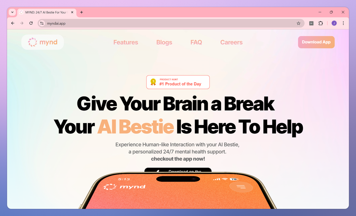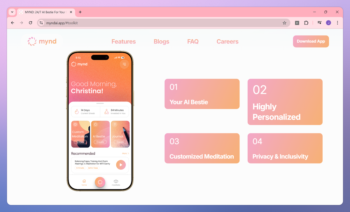 MYND is an AI-powered mental health companion that provides personalized support 24/7. It creates custom meditation sessions based on your mood, offers real-time emotional guidance through an AI Bestie, and tracks your mental wellness progress to help individuals experiencing anxiety, overwhelm, or sleep difficulties improve their mental health.