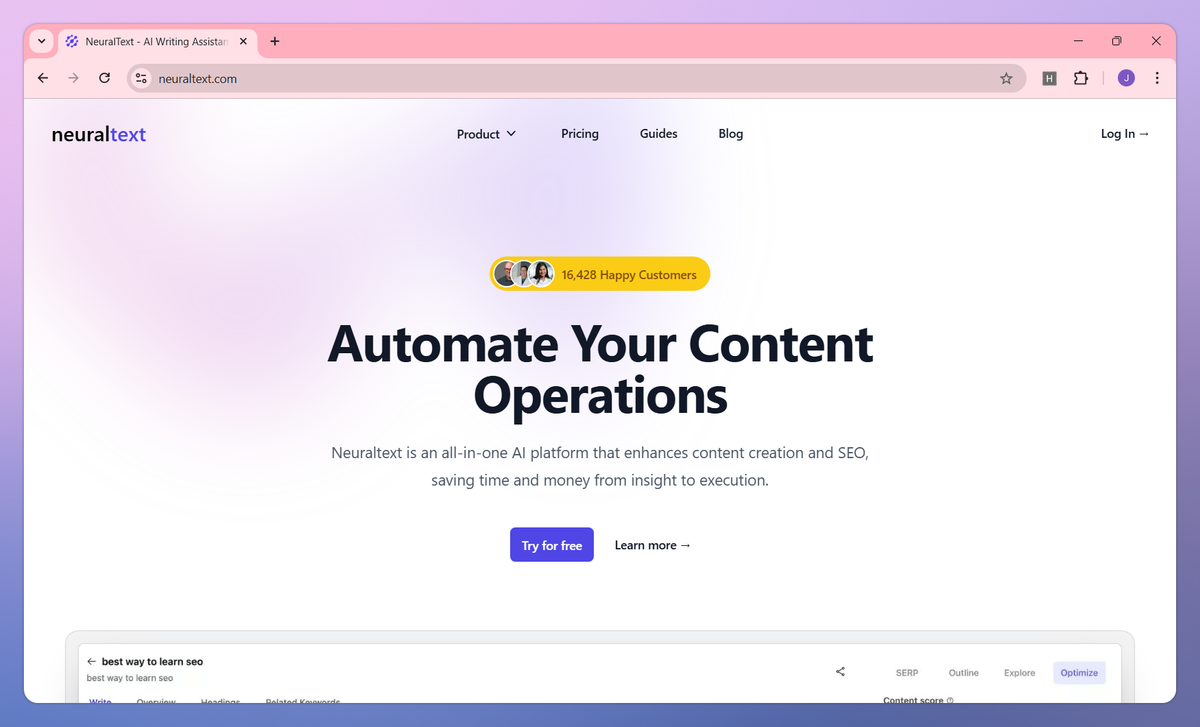NeuralText stands apart with its AI writing assistant that offers inline autocompletion, helping content marketers and writers overcome creative blocks faster than traditional content creation methods. The tool's user-friendly interface makes extracting insights from SERP data accessible to SEO teams without technical expertise. NeuralText supports content creation across 17 languages including English, Spanish, German, and French, making it ideal for marketing teams managing multilingual campaigns.