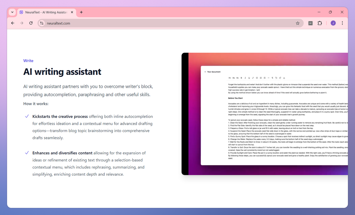 - Overcome writer's block with contextual autocompletion, paraphrasing options, and content enhancement capabilities.