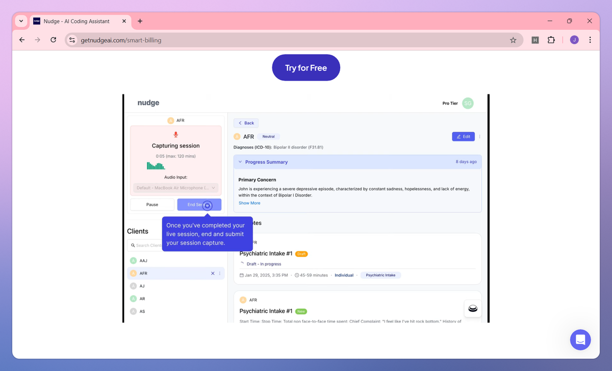 Nudge is an AI-powered clinical documentation assistant for mental health professionals. It records therapy sessions to generate comprehensive SOAP notes, provides critical session insights for treatment planning, and integrates directly with over 140 EHR systems to help psychiatrists, therapists, and counselors reduce documentation time by 8+ hours weekly.