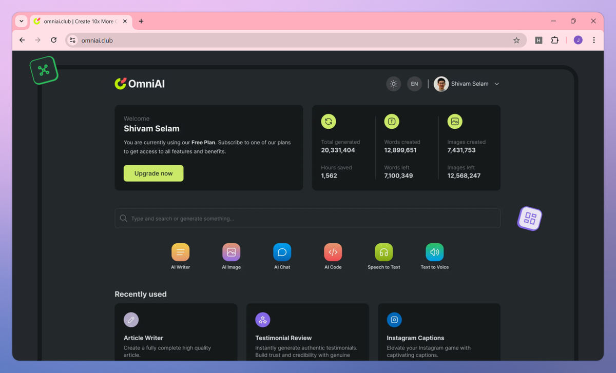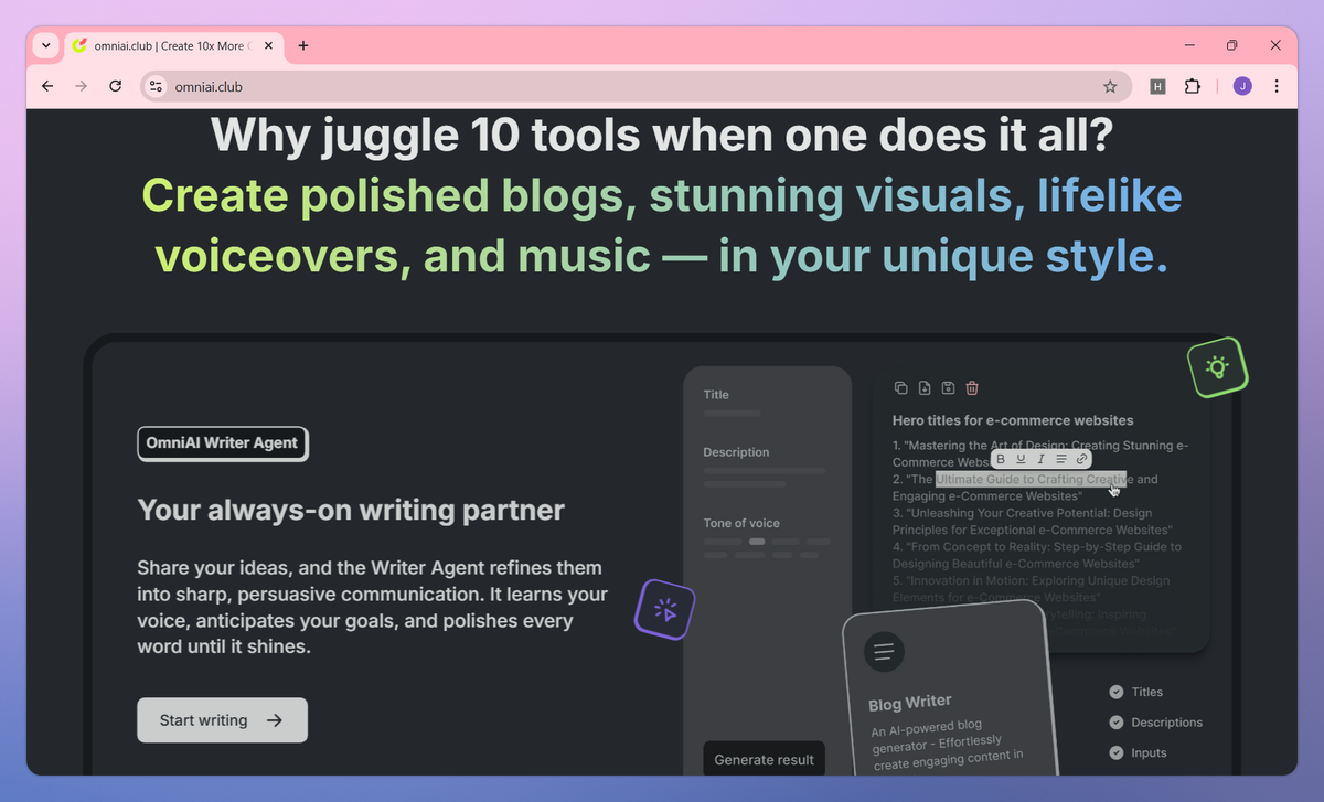 OmniAI is an AI-powered content creation platform that combines multiple specialized agents for writers, coders, and designers under one system. It generates polished blogs, produces clean code snippets, creates custom graphics, converts audio to text, and clones voices from short samples to help marketers, founders, engineers, and content creators build their brand authority without managing multiple tools.