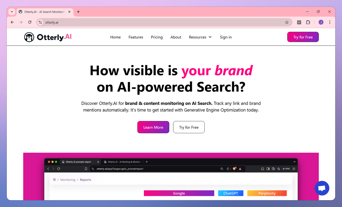 Otterly.AI is an AI search monitoring platform that tracks brand and content visibility across AI-powered search experiences. It monitors brand mentions and sentiment, tracks link citations, and analyzes search prompt performance to help marketing teams understand and improve their digital presence on platforms like Google AI Overviews, ChatGPT, and Perplexity.