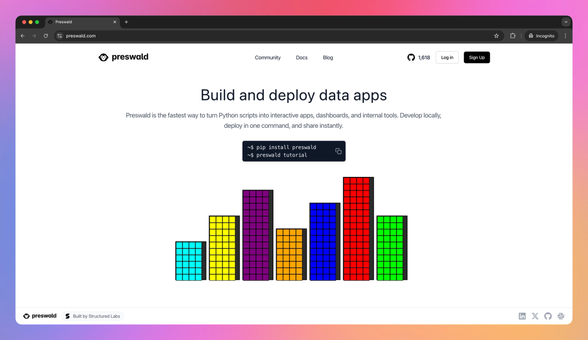 Preswald is a Python framework that turns scripts into interactive data apps, dashboards, and internal tools without requiring frontend code. It provides pre-built UI components like tables, charts, and forms to help data scientists and analysts create shareable, production-ready applications with minimal effort.