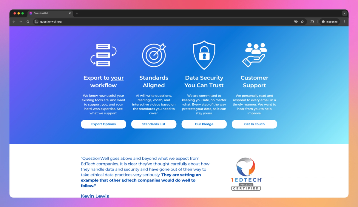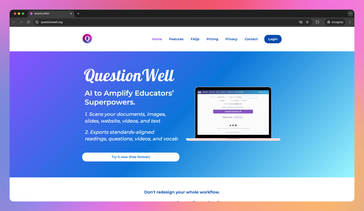 QuestionWell is an AI-powered tool for educators that generates questions and learning materials from uploaded content. It creates standards-aligned readings, questions, and vocabulary lists, which K-12 teachers and professors can export to platforms like Canvas and Kahoot.