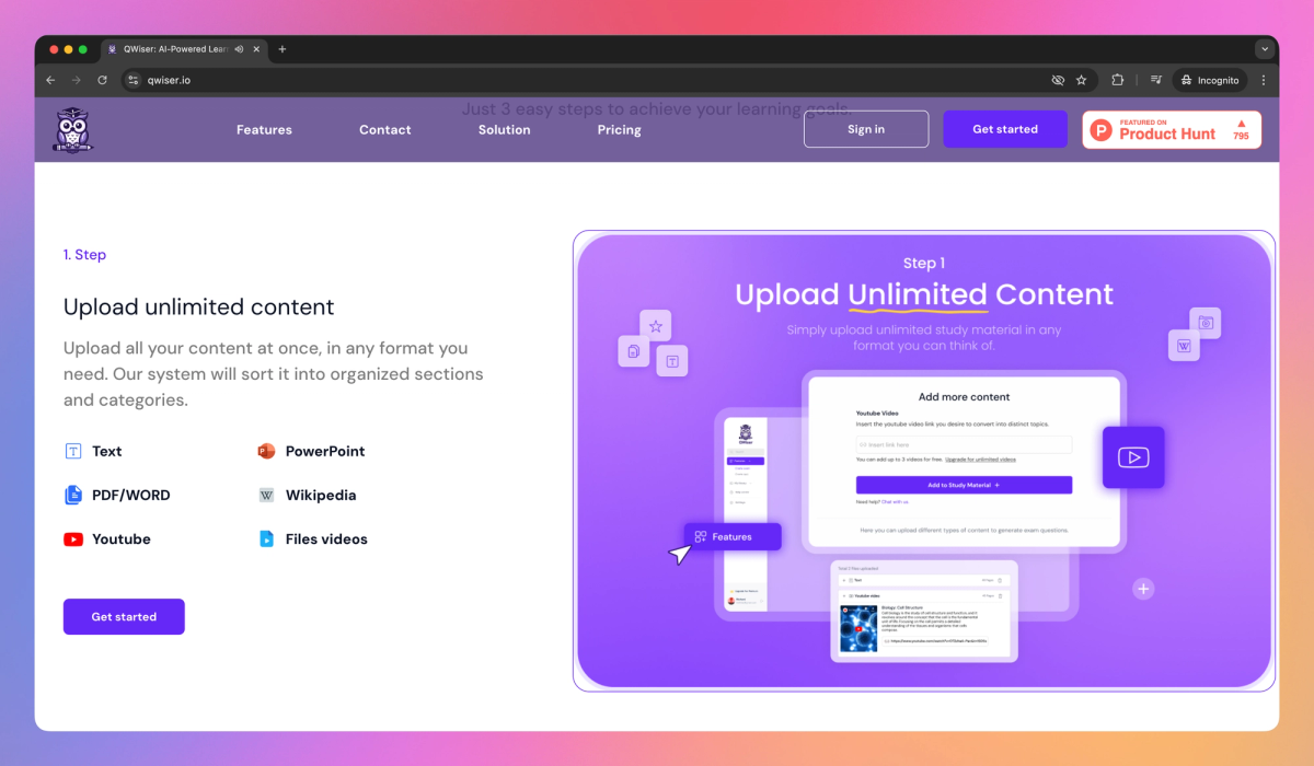 QWiser is an AI-powered learning assistant that turns study materials into organized frameworks and interactive study sessions. It processes text, PDFs, videos, and presentations to create personalized quizzes and exams, helping students and educators improve learning outcomes and save time.