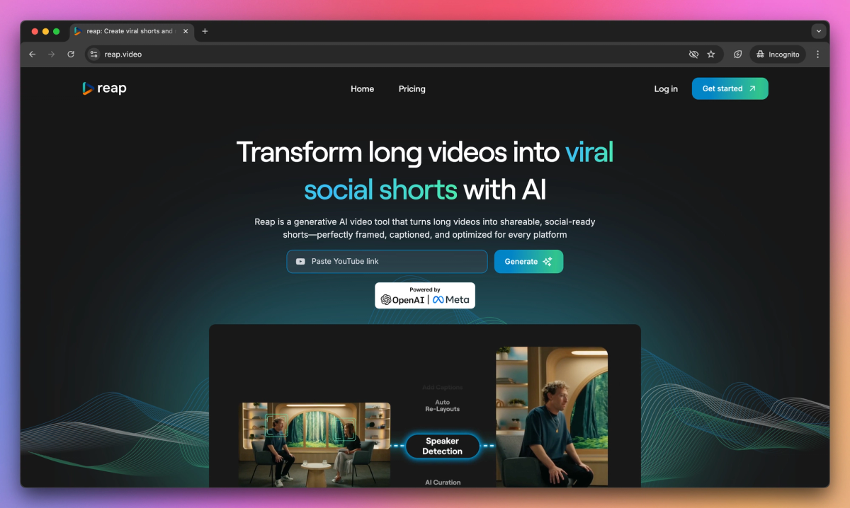 Reap is an AI-powered video repurposing tool for content creators and social media managers. It automatically extracts engaging clips from long-form videos, adds accurate captions, and optimizes content for multiple social platforms to help creators produce high-performing videos in minutes instead of hours.