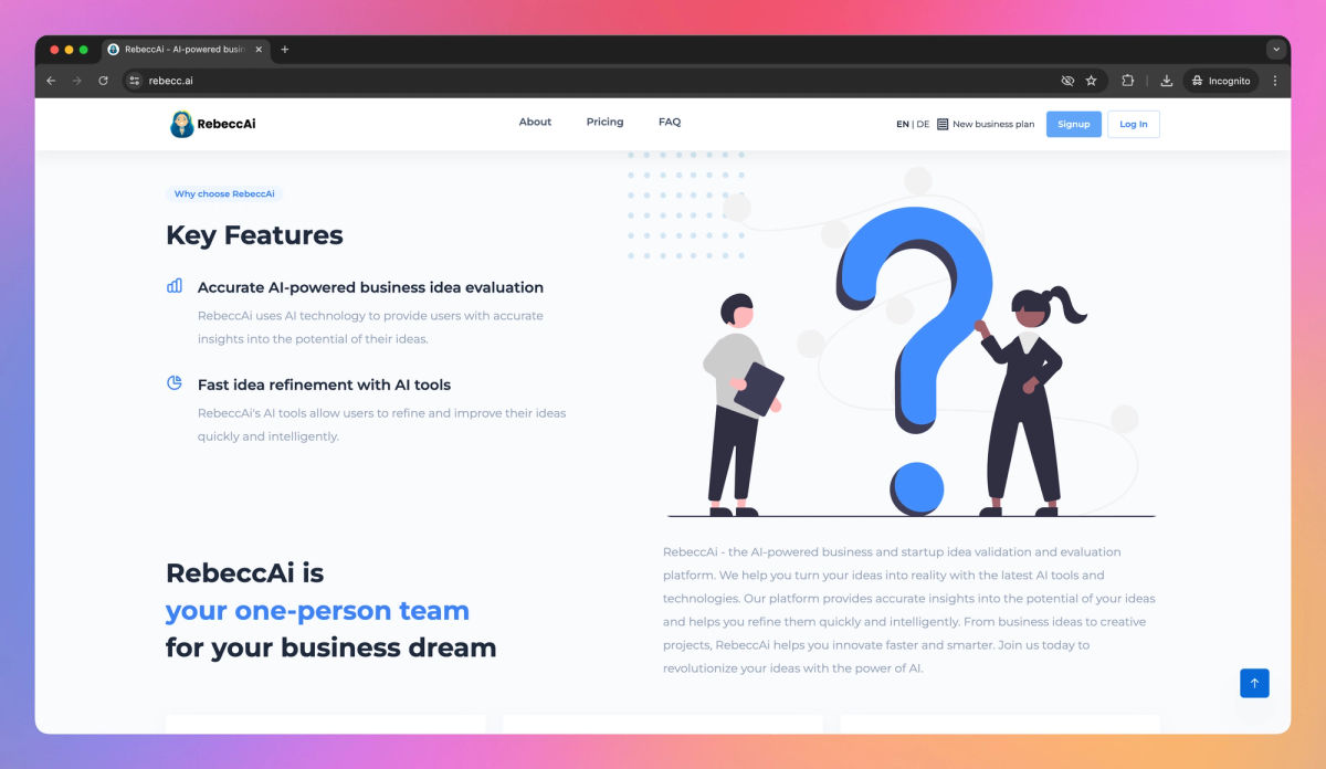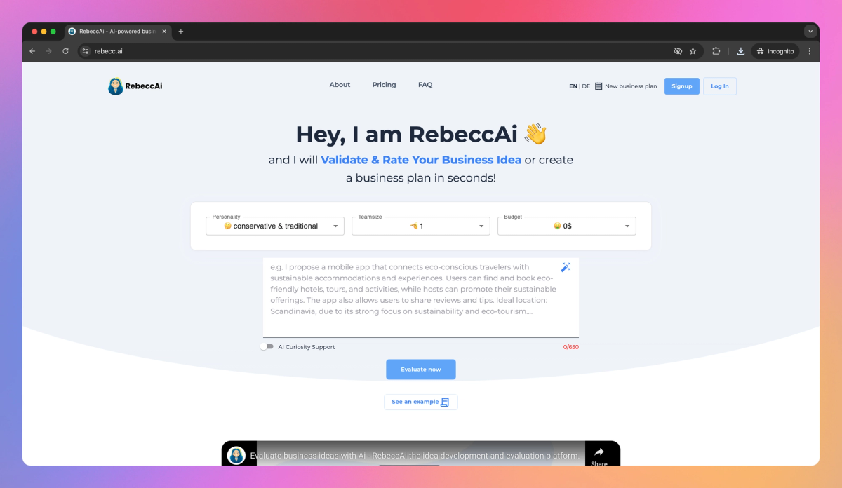 RebeccAI is an AI-powered platform designed for business creators and small teams. It provides accurate business idea evaluations, detailed assessments, and improvement suggestions to help entrepreneurs refine their concepts and move forward confidently.