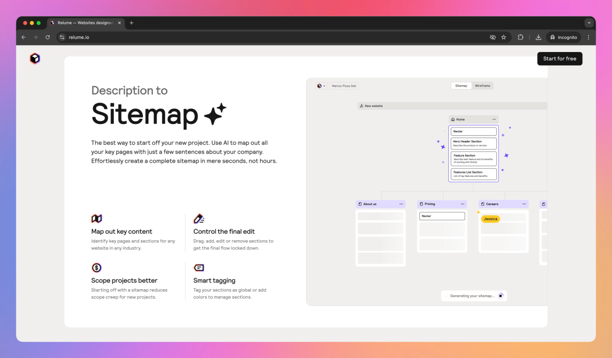 - Generate comprehensive website sitemaps in seconds using AI based on brief company descriptions and website goals.