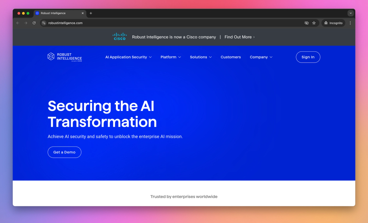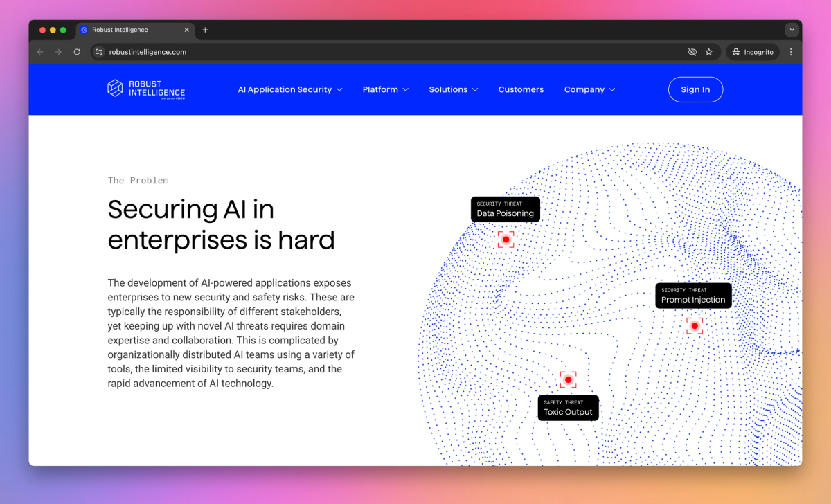 Robust Intelligence provides AI application security, protecting against threats like prompt injection and data poisoning through automated testing and real-time safeguards. It allows AI developers and security teams to identify vulnerabilities in machine learning models and intercept malicious inputs in production, preventing sensitive data leaks or toxic chatbot responses.