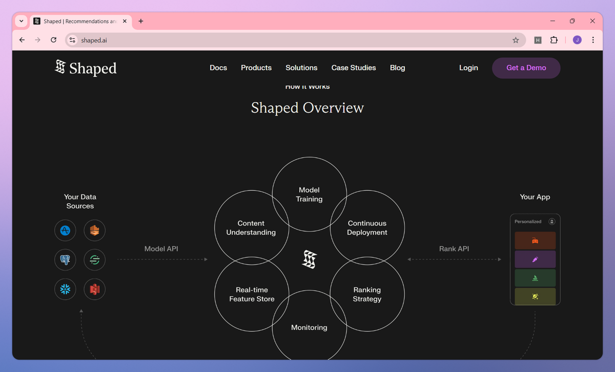 Shaped is an AI-powered recommendation and search platform that connects to existing data sources. It processes unstructured text and images into vector embeddings, personalizes content in real-time based on user behavior, and enables semantic search across catalogs to help developers and marketers create more relevant product recommendations and content discovery experiences. Shaped works across marketplaces, social media platforms, and e-commerce sites to increase engagement and conversion rates.