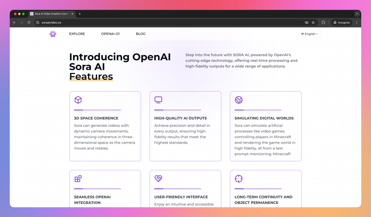 Sora AI Video is a text-to-video generation system that turns written descriptions into high-quality video content, with features like dynamic camera movements and 3D space management. It helps filmmakers, social media creators, and marketing teams produce videos from simple text prompts, create animated characters, and build realistic scenes with multiple camera angles for their projects.