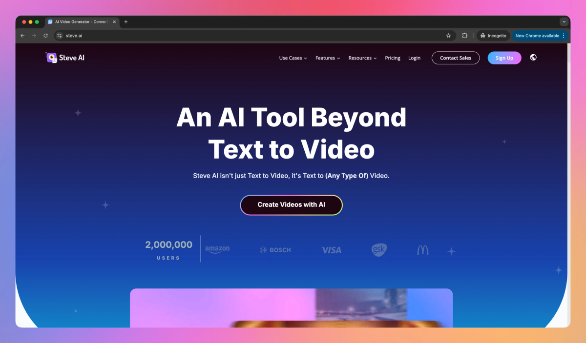Steve AI is an AI-powered video creation tool that converts text inputs into animated or live-action videos. It allows marketers to produce product demos, educators to develop instructional content, and social media managers to craft engaging posts for platforms like Instagram and LinkedIn.