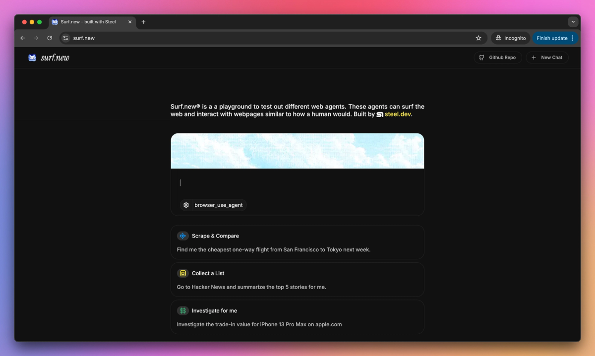 Surf.new is a playground for testing web agents that navigate the internet and interact with websites as humans would. It finds flight deals, summarizes news stories, and checks trade-in values to help researchers, data analysts, and online shoppers make informed decisions without manual browsing.