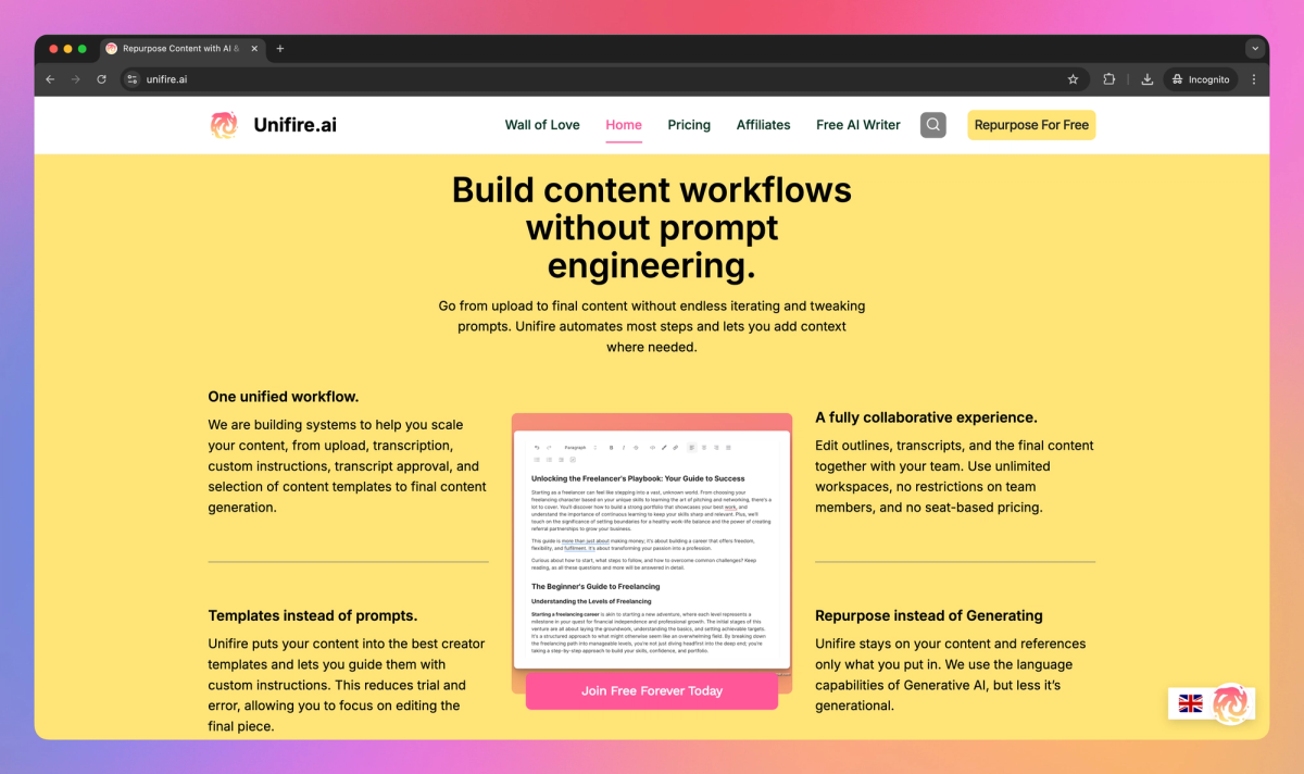 Unifire AI repurposes audio, text, and video content into 32 different formats, from social media posts to long-form articles. Content marketers can transform a 1-hour podcast into a 6,000 word blog post or generate 15 LinkedIn posts from a single upload, saving time on content creation.
