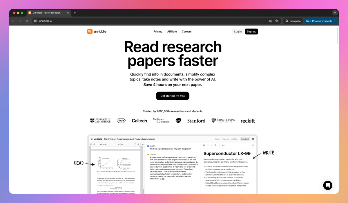 Unriddle is an AI-powered research assistant that helps researchers, students, and academics uncover insights from complex information. It offers document analysis, information extraction, and question-answering functions to speed up research processes and improve understanding of intricate topics across academic disciplines.