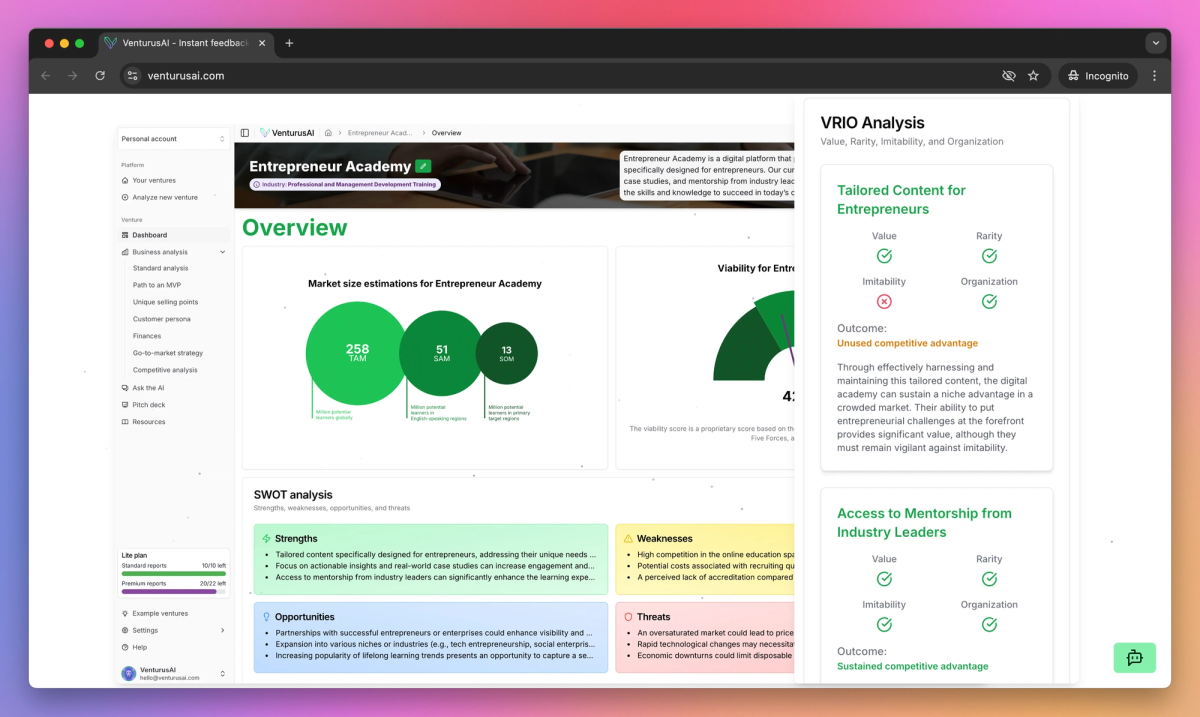 VenturusAI sets itself apart with real-time business analysis feedback that helps entrepreneurs turn concepts into solid business plans within minutes. This instant feedback approach proves beneficial for startup founders who need quick validation before pitching to investors or refining their business models. The platform's focus on immediate, actionable insights helps business owners make informed decisions about their ventures.