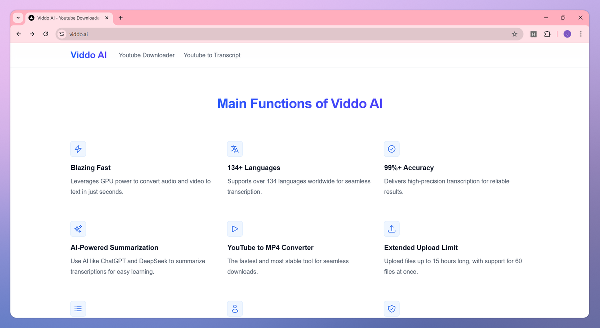 Viddo AI is a YouTube downloader and transcription platform that converts videos into text and mind maps. It transcribes content in over 134 languages with 99% accuracy, identifies different speakers, and creates AI-driven summaries to help educators, business professionals, and content creators extract valuable information from video content.