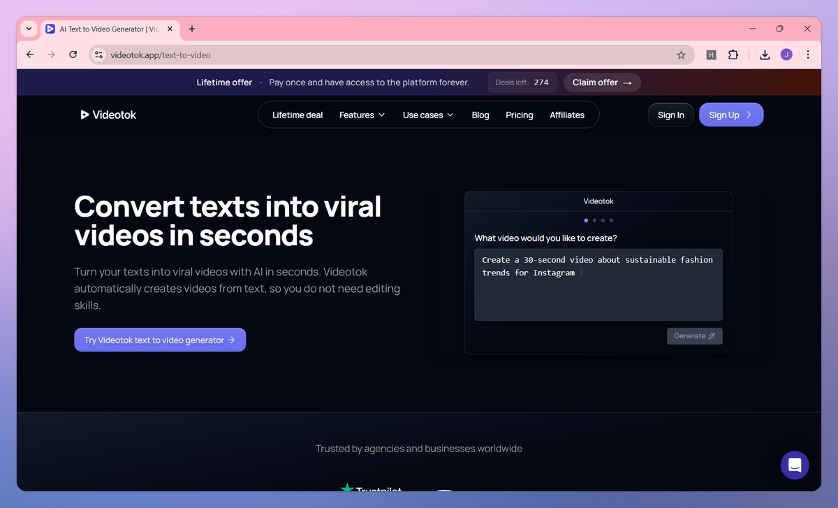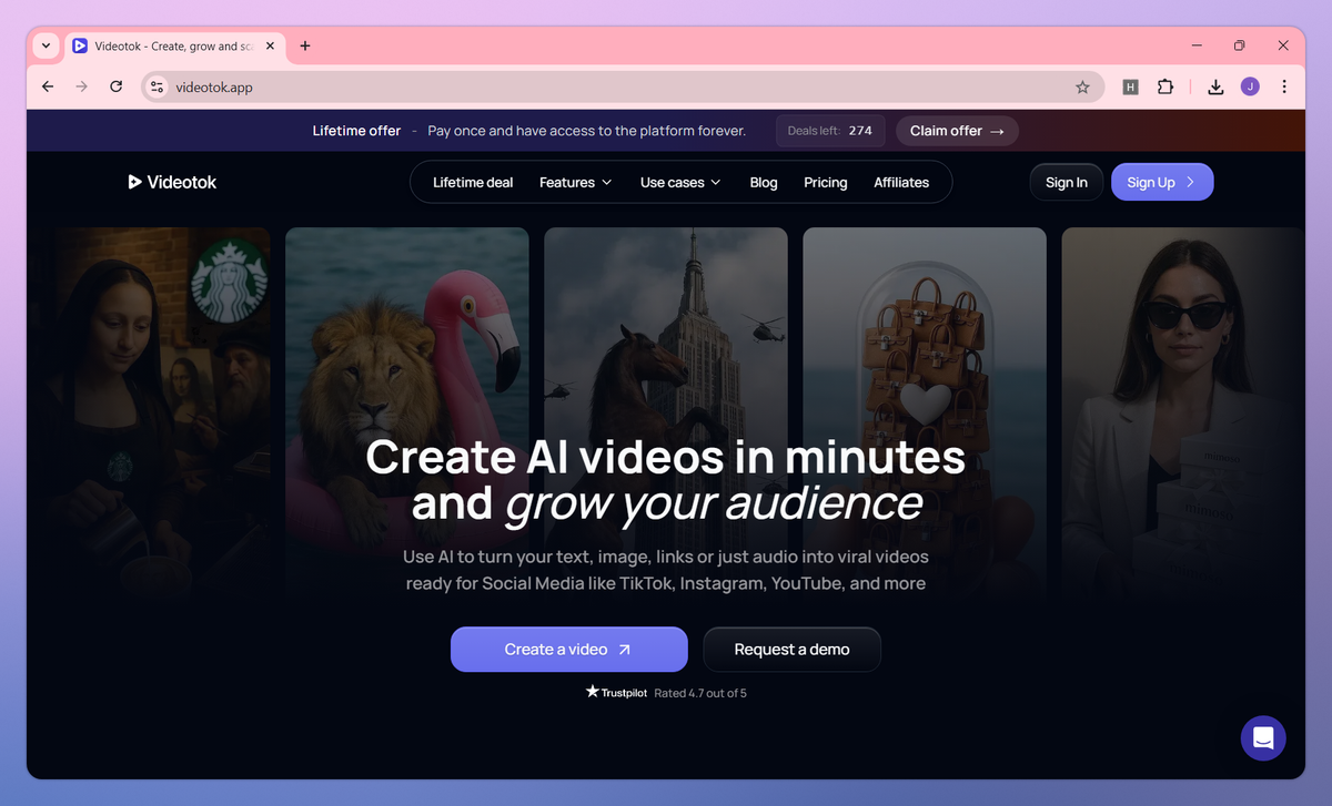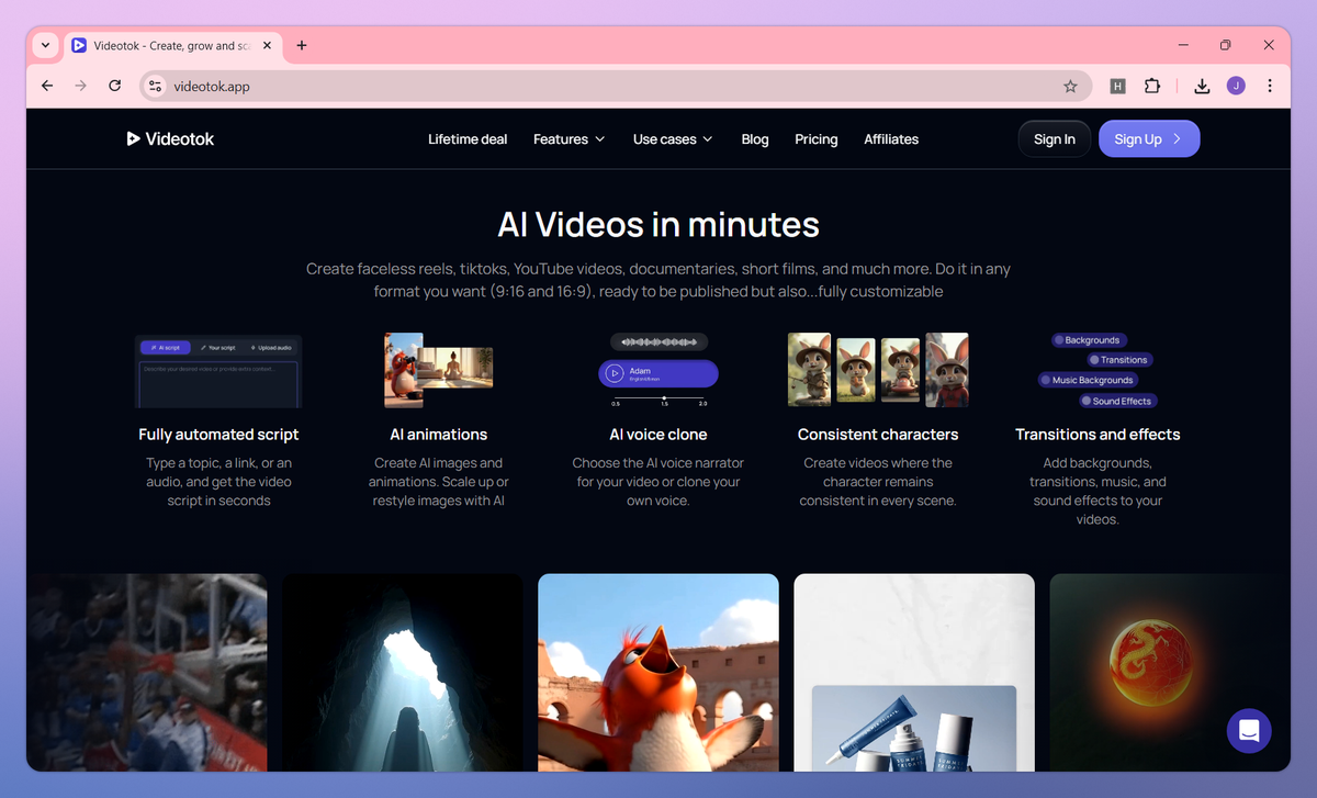 Videotok is an AI video creation platform that converts text, links, and audio into professional videos for social media. It generates scripts, selects visuals, adds voiceovers, and applies transitions to produce ready-to-publish content for YouTube, TikTok, and Instagram. Content creators and marketers can craft faceless videos, design consistent AI avatars, and develop UGC-style ads without technical skills or appearing on camera themselves.