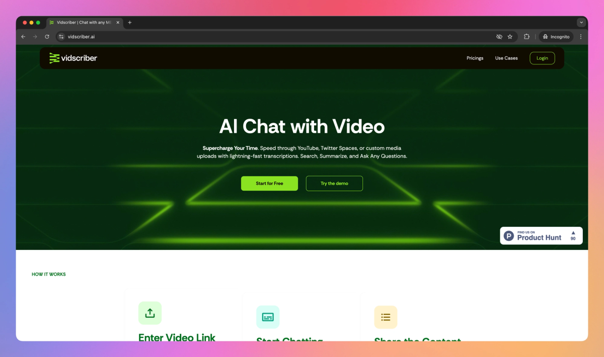 Vidscriber is an AI-powered tool that transcribes and analyzes video and audio content. It converts media from YouTube, Twitter Spaces, and custom uploads into searchable text, generates summaries, and answers questions about the content, helping content creators, marketers, educators, and researchers extract valuable insights quickly.
