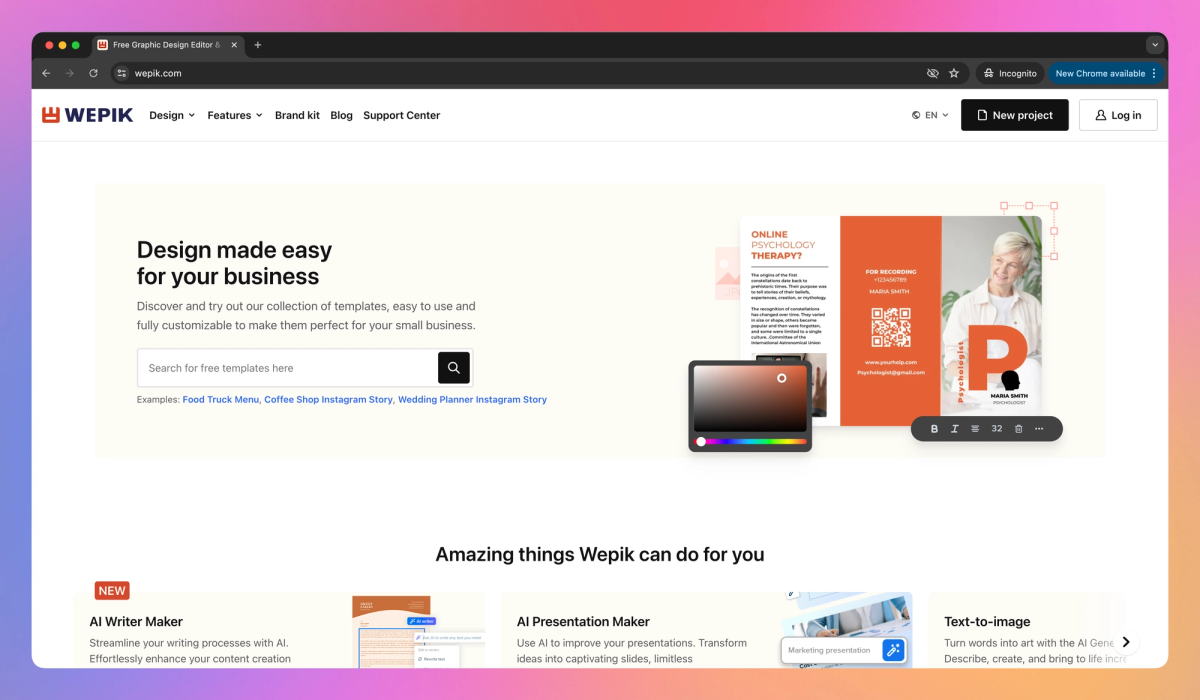 Wepik is an AI-powered design tool that allows small business owners and social media managers to create professional-looking graphics in minutes. The platform offers customizable templates for social media posts, presentations, and marketing materials, enabling users to produce eye-catching visuals without graphic design experience.